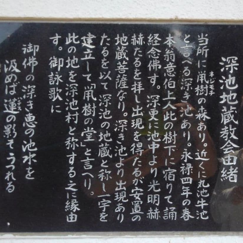 深池町の、「深池」という名前は、この地蔵堂に由来する。深池町は全てがここから始まったと言ってよい。地蔵堂のあるこの地は、大変霊験あらたかな地で、大昔はこの地には森のように大木が生い茂っていた。木漏れ日として木々の間をすり抜けて入ってくる、わずかな光以外は全くなく、暗静な地であり、さらに深淵な池には霊水を豊富に蓄えられていた。昭和53年(1978)に、地元深池町の信者のご尽力により、歴史あるお堂から現在の形に再建された。主に浄土宗と本願寺の町民で守られている。